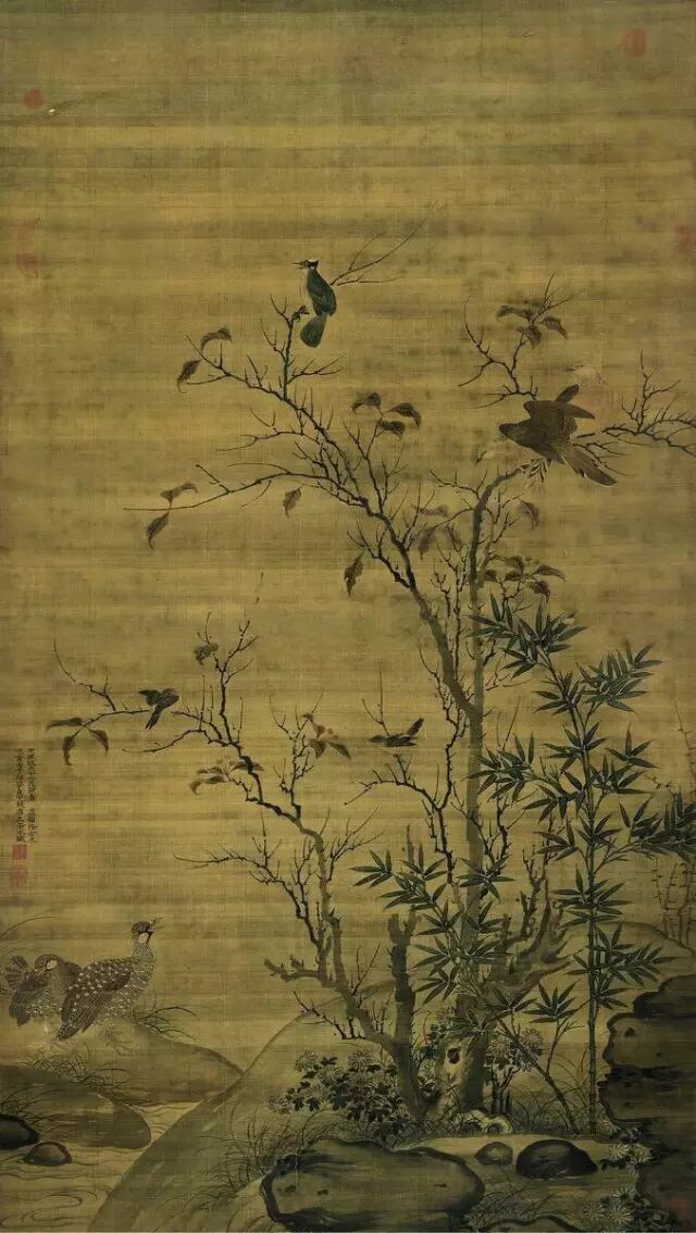 元 王渊 古木鸣禽图 立轴 设色绢本