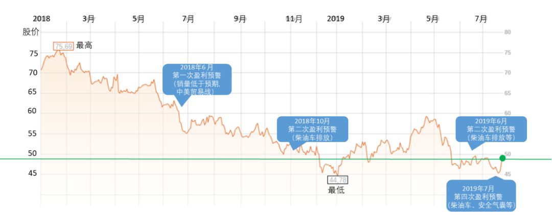 期间,戴姆勒密集地发布了四次盈利预警,中美贸易战造成成本上升,涉及操纵柴油排放的车辆召回,原因不一,但每一次盈利预警都带来一个股价的小低谷。