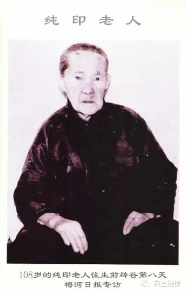 一百零九岁的史纯印于一九九五年(乙亥年)正月十五夜里九时吃完元宵后,用热水洗头洗脚擦身,换上较洁净的衣服,即不饮不食开始辟谷。正月二十三(辟谷第八天)市老龄委和梅河日报的领导、记者来家采访,家人拒绝说:“老人不吃不喝已经八天了,不能接待了。”未想到老人在自己的房间里却大声呼喊:“快让他们来,我没有病!”使得家人非常尴尬。老人与采访者谈笑风声,畅谈社会主义好、生在这个社会是有福……谈话让人非常开心。记者为老人拍下了一生唯一的坐姿照片,留下了永久性的纪念。