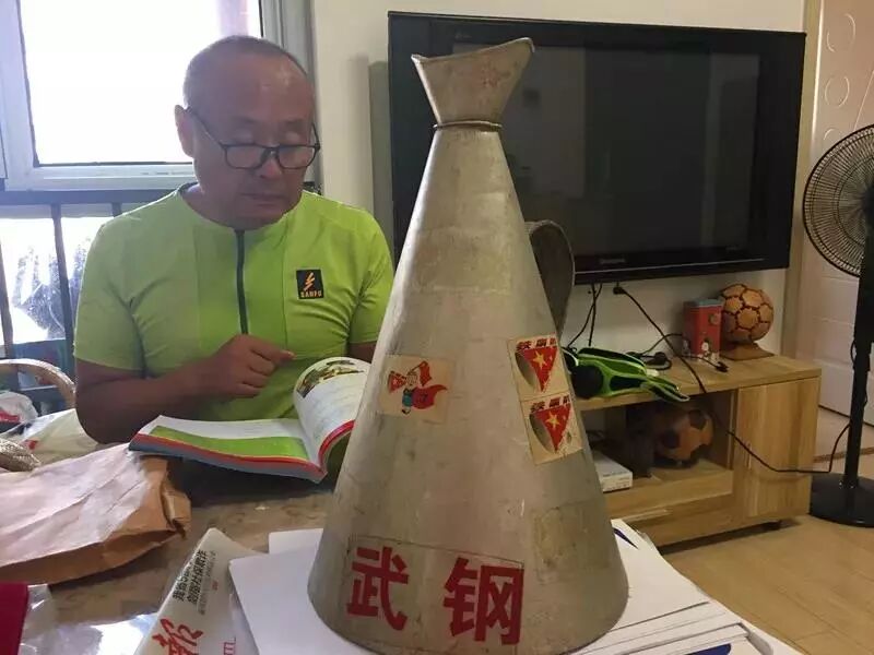 后来他找单位的老师傅用白铁打造了一只真正的铁喇叭,还装上了蜂鸣器,去哪儿看比赛,他就带到哪儿。