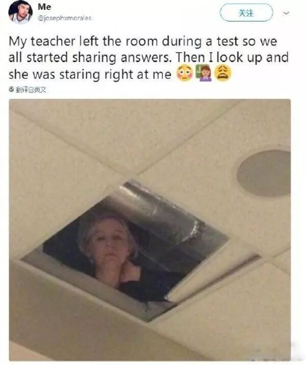 之前有个外国网友在推特上晒了张照片:“老师在考试中途离开教室,于是我们开始互相讨论答案。然而,无意间抬头一看,发现……”