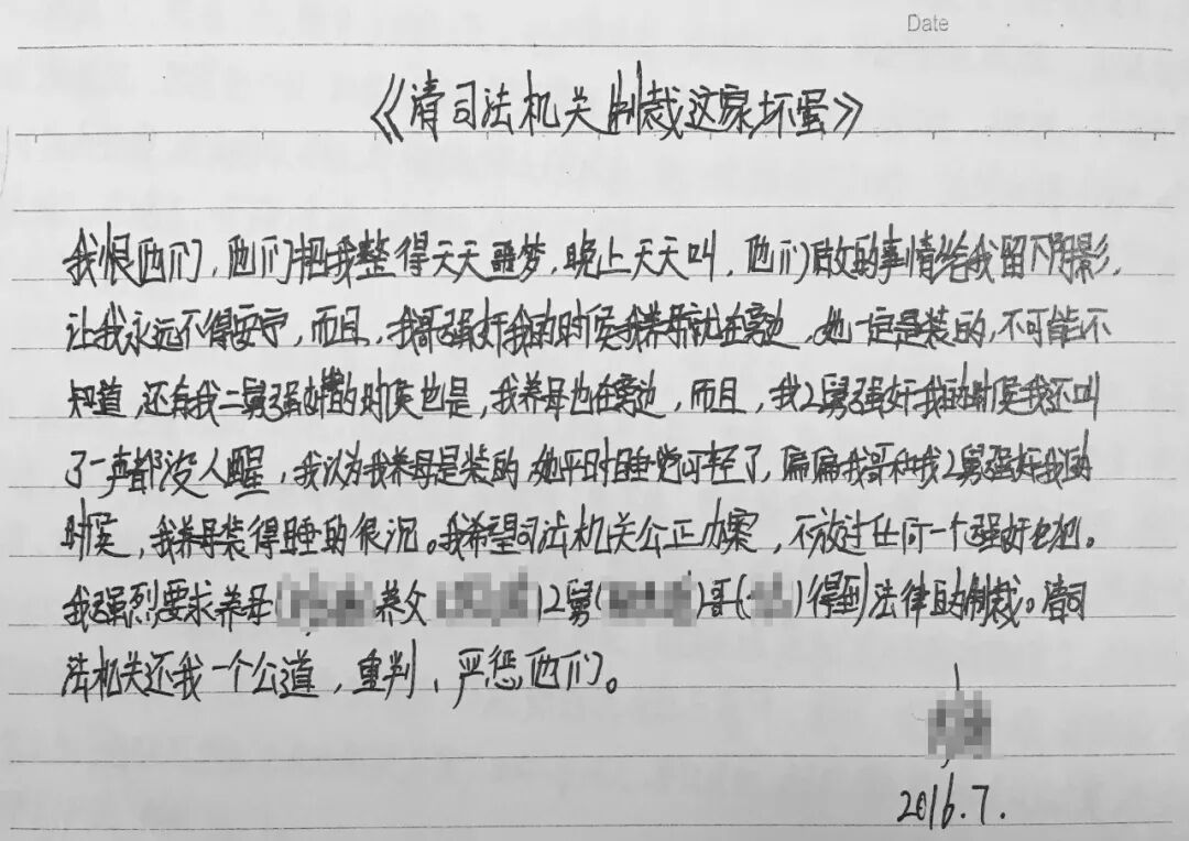 庭审前法官询问小芳的意见,她说不愿意再面对养母。她写了一封信给养母——“从我记事开始,我就没有得到过母爱……有你这样的妈妈吗?……在家里我没有欢乐……有你这样的妈妈吗?最可恶的是,你的老公、儿子、弟弟,欺负我、性侵我,你无动于衷……你有做妈妈的样子吗?”