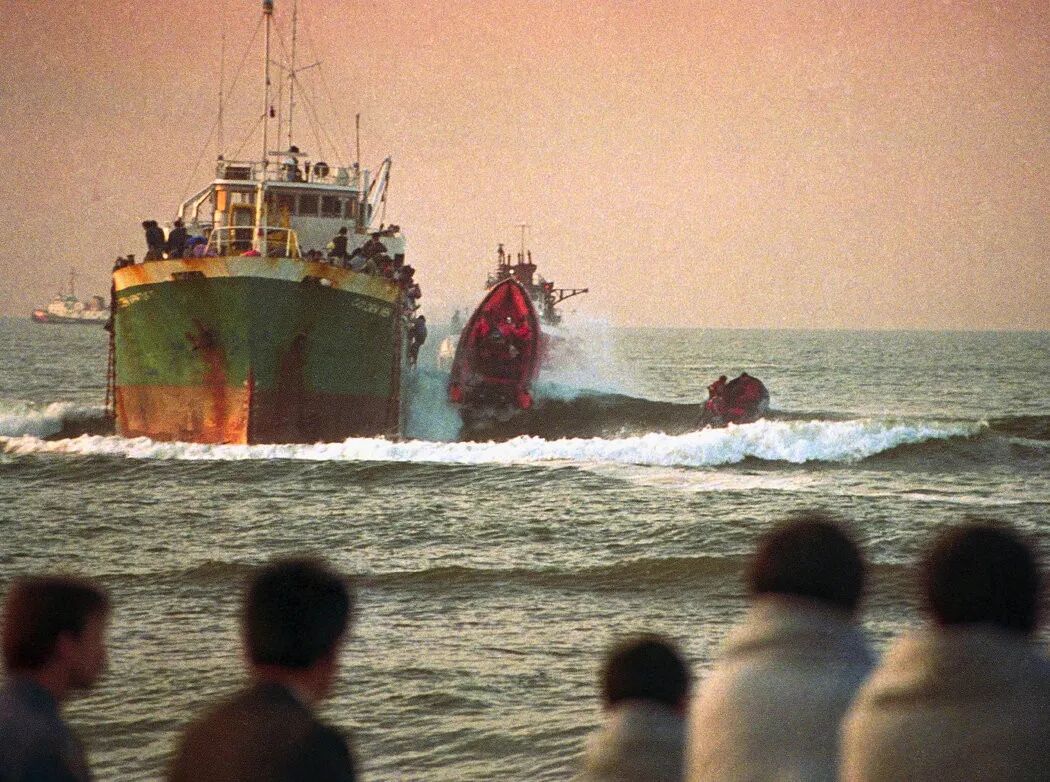 “金色冒险号”是一艘45米长的货轮,当它冲上海滩后,在狭小的货舱里待了半年多的286名偷渡客,都挤上了甲板。他们面黄肌瘦,惊慌失措,不断有人从离水面6米高的甲板边缘跃下,没入漆黑的海水中。