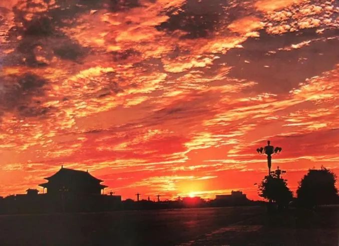 照片拍摄于1961年。画面中,扑面而来的彩霞占据了绝大部分,一轮红日透过彩霞从庄严肃穆的天安门广场东面冉冉升起。画面简洁并富有动感,色彩鲜艳,充满张力,这是一幅能让人产生强烈自豪感的摄影作品。