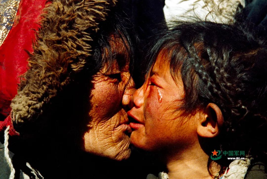 1996年,青海玉树遭遇百年未遇的大雪灾,经过解放军近10个小时的寻找,终于找到了雪灾中失踪12天的6户21名藏族同胞。青海玉树县结隆乡右眼雪盲口哑的75岁老阿妈卓措拉毛深情亲吻重聚亲人。