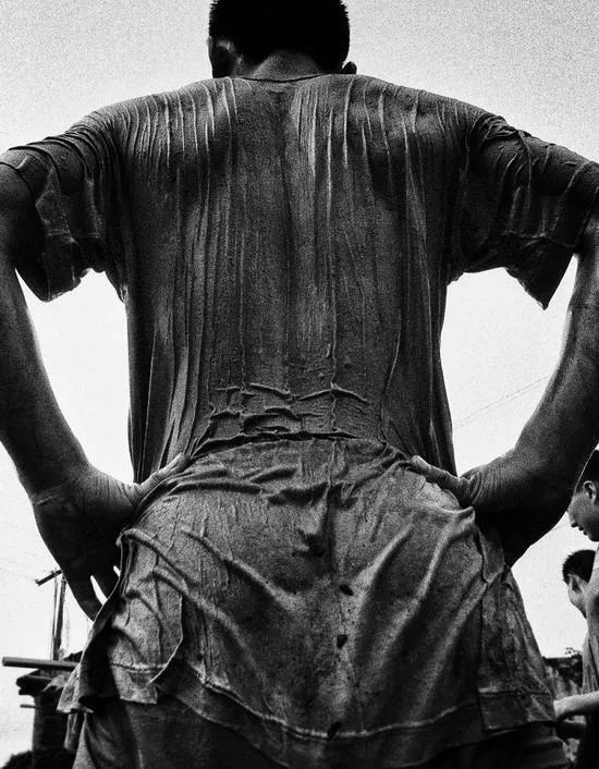 1998年7月30日,九江市水修县郭东大堤上,武警战士与洪水搏斗两小时之后的背影。