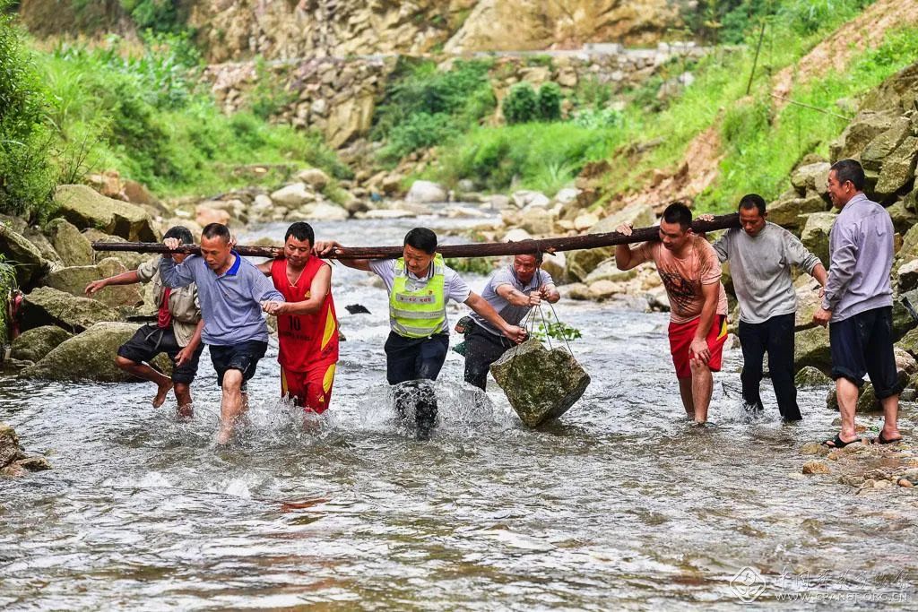 2019年6月30日,在乌英苗寨,驻村第一书记韦桂华(右四)、党员梁成兵(右三)、梁志新(左二)带领村民维修河堤。乌英苗寨位于黔桂交界的大苗山深处,共有140户600多人。其中100户属广西融水苗族自治县杆洞乡党鸠村,40户属贵州从江县翠里瑶族壮族乡南岑村。由于地处偏远,山多地少,脱贫攻坚任务艰巨。