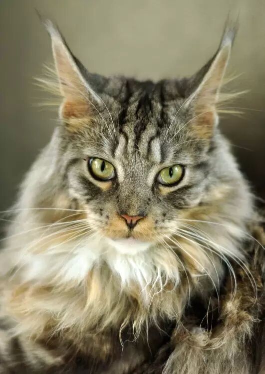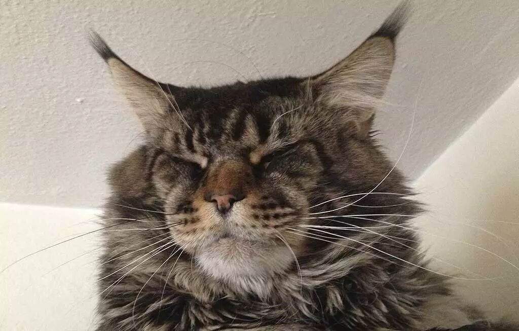 和其他品种的家猫比起来,缅因猫长得非常“虎”:突出的吻部,四方下巴,下颌结实,高颧骨,特别大的耳朵,特别大的铜铃似的眼睛。还有,胡须特别长,像要成仙了一样。