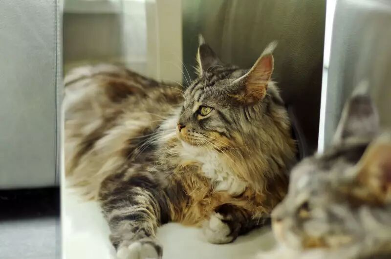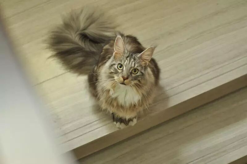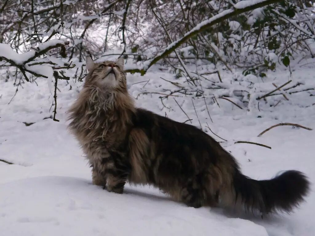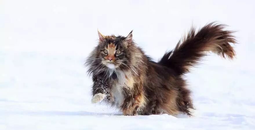 缅因猫生活的缅因州冬季十分寒冷,缅因猫也是自带了一身的抗寒装备。缅因猫头部和颈部的毛稍短,身体两侧和腹部的毛则较长——可以在它们卧在雪地和冰面上的时候保暖,有些猫还会长出像狮子一样的鬃毛(其实更像茂密的胸毛就对了)……它们毛茸茸的、像浣熊一样的大尾巴不容易被雪打湿,还可以围住脸部和肩膀来防止风雪呼呼往脸上吹。