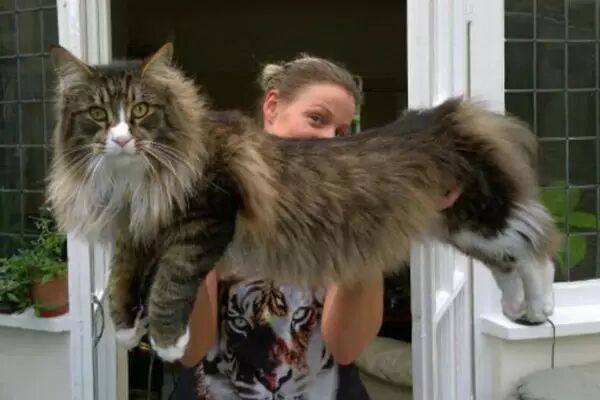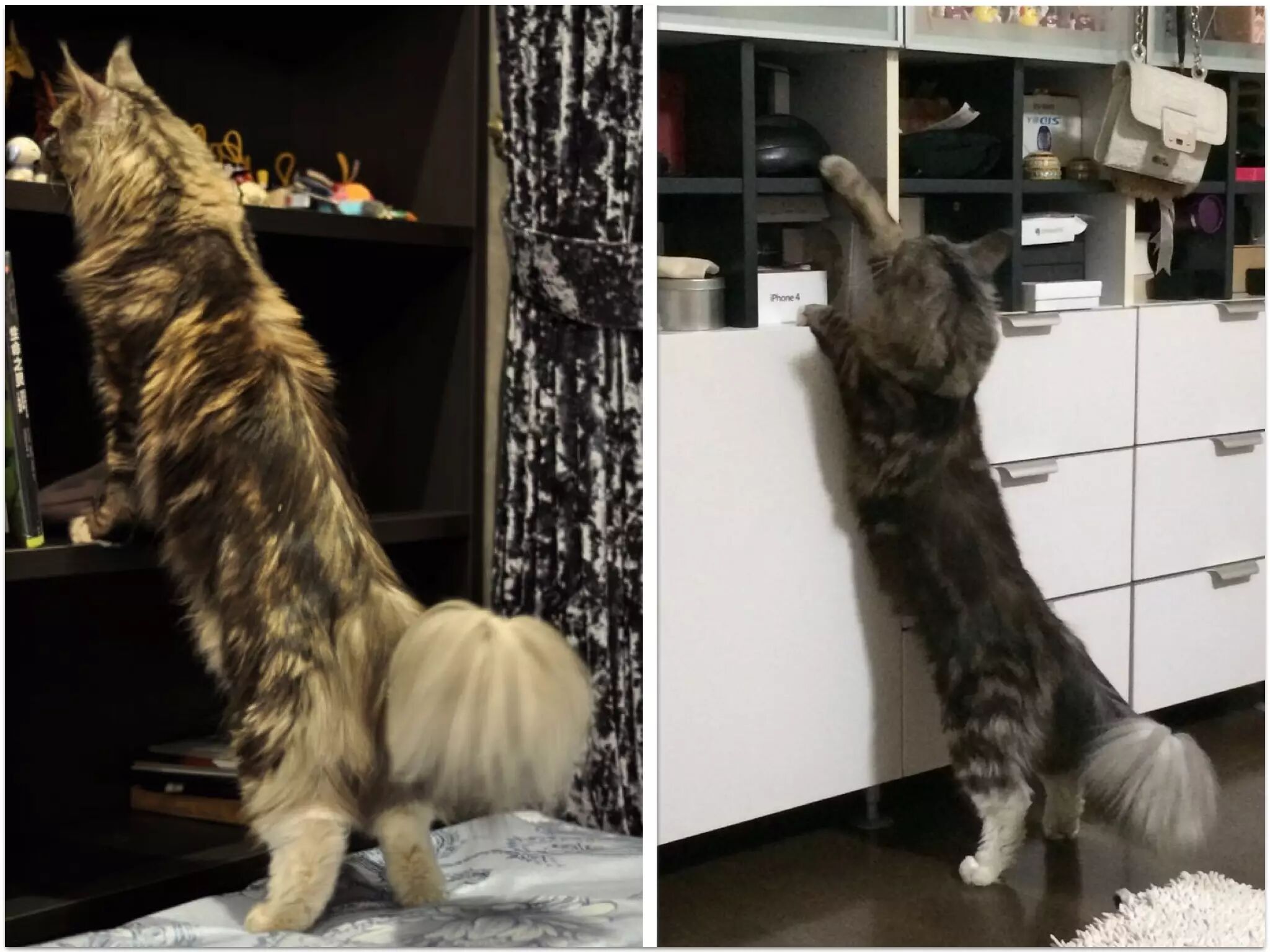 缅因猫体型巨大、结实、充满力量感,它们成年后,雄性体重可达9.5到15.9公斤,雌性稍小,在6.8到13.2公斤之间——碾压其他猫咪毫无压力。它们最长可以长到120厘米左右(包括尾巴),吉尼斯世界纪录中最长猫咪记录的保持者就是一只缅因猫,它这样伸展开之后身长可达48.5英寸(约合123厘米)。